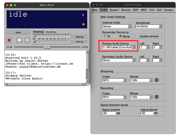 To finish, open your preferred broadcasting software, such as BUTT. Go to the Audio Tab > Audio Device and select your VAC.